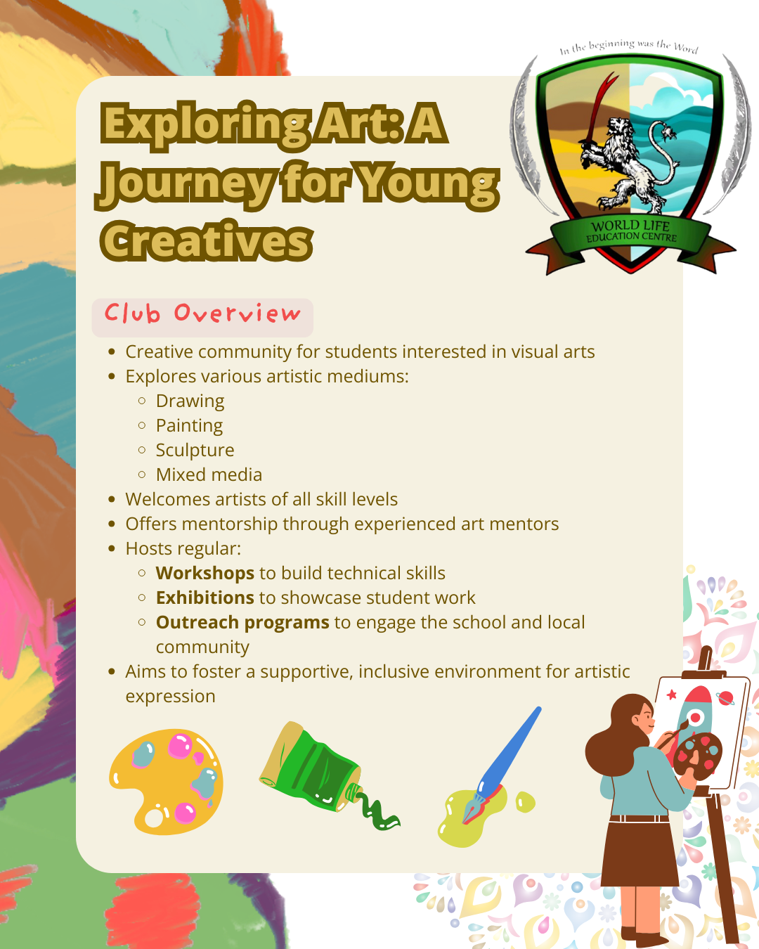 The Art Club hosted by WLEC is a creative community where students explore various forms of artistic expression, including drawing, painting, sculpture, and mixed media. It provides a supportive environment for artists of all levels to share ideas, collaborate on projects, and develop their artistic abilities. Our Art Club mentors organize workshops, exhibitions, and outreach programs to promote art appreciation and creativity within the school, and beyond in the local community.