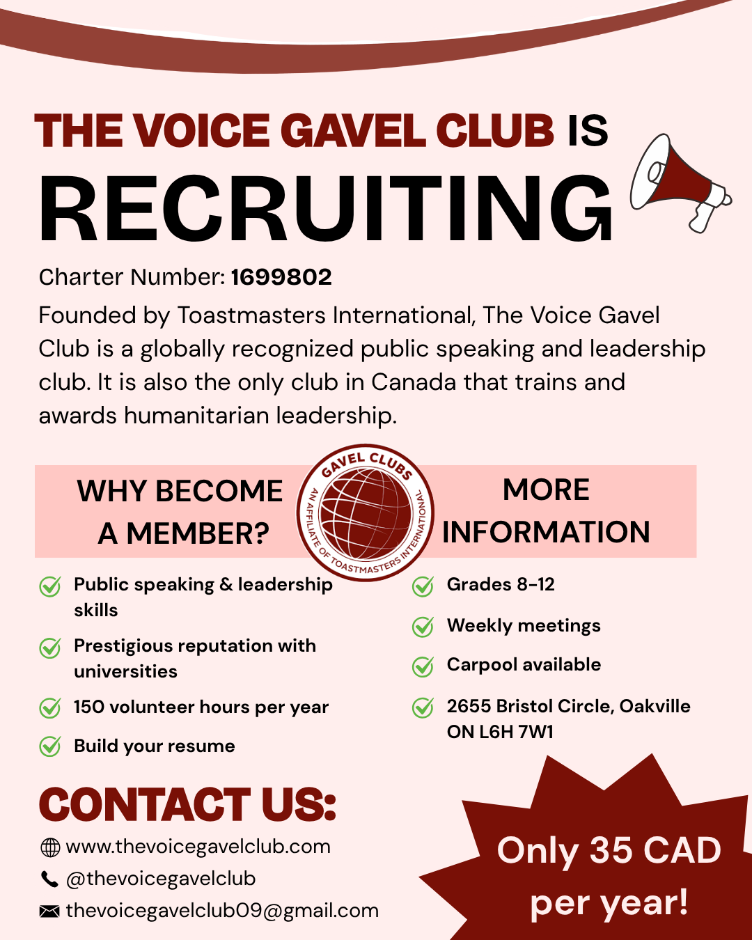 The Voice Gavel Club, of District 86, Charter # 1699802, having been established on campus at the World Life Education Centre, originally in Markham Ontario almost two decades ago, is now most recently thriving and currently recruiting new members at our Oakville, Ontario campus. The Voice Gavel Club is affiliated with the renowned Toastmasters International organization, and aims to train youth between the ages of 14-18 in developing their public speaking and humanitarian leadership skills. We welcome new members under the age of 18, who are therefore not yet eligible to become regular members of Toastmasters International (membership being open to adults 18+ only).